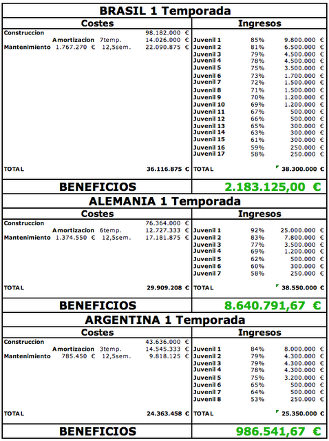 para eso es la info, para ayudar a cada manager a la hora de toma de decisiones en las gestiones de su equipo, vale? me mola que cada uno tenga su vision y lo haga a su manera, ojala pasara igual con las avanzadas!!!....jajaja pero, como tu conclusion es un poco extrema o radical, yo me voy al otro extremo...jeje seria viable el Striker, a largo plazo, sin escuelas?? ya que realmente son la "cuna" de los juves...jeje que le pasaria al mercado de juves, a corto plazo, si todos cerraramos las escuelas?? y a los precios?? cuando hay poca oferta y mucha demanda.... reflexiones, no??...jeje pero, como hablas de la palabra "rentabilidad", pues centremonos en ella y como ejemplo: |